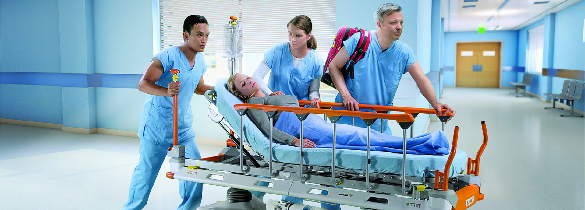 La sala de urgencias es una de las unidades más complejas de un hospital porque está sujeta a una variedad de influencias y confronta diariamente situaciones nuevas, sorprendentes y que con frecuencia suponen una amenaza para la vida. La camilla sprint 100 asegura un transporte rápido del paciente, un manejo sencillo y permite las primeras investigaciones importantes.