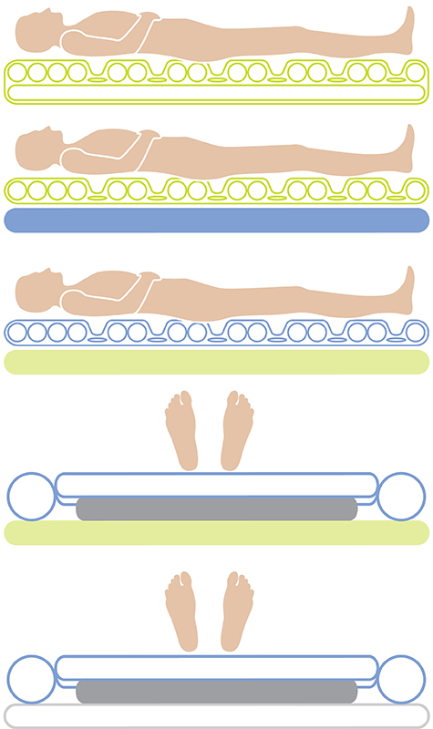 La terapia de presión alternante (tecnología de 3 celdas, presión cero, ciclos de 7,5 minutos) es el modo terapéutico fundamental que simula el movimiento natural del cuerpo y de esta manera previene y trata las úlceras de decúbito.
