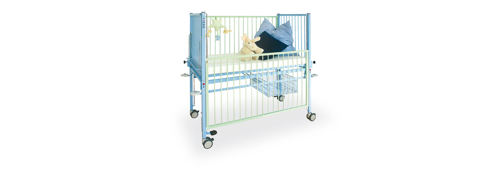 A mobile pediatric bed with adjustable height of the patient surface and mechanical positioning. The patient surface area is made of welded steel meshing and allows for Trendelenburg and Anti-Trendelenburg tilt positions. The side rails may be set to one of three positions.