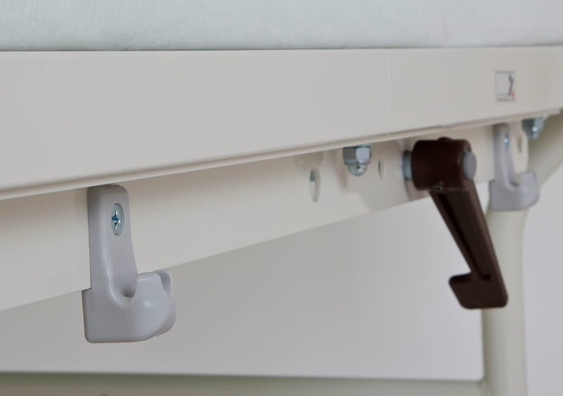 Bars with plastic hooks are situated on both sides of the bed. The bars can be used to hang small accessories (holder for slippers, basket for a bedpan, Redon bottle holder).