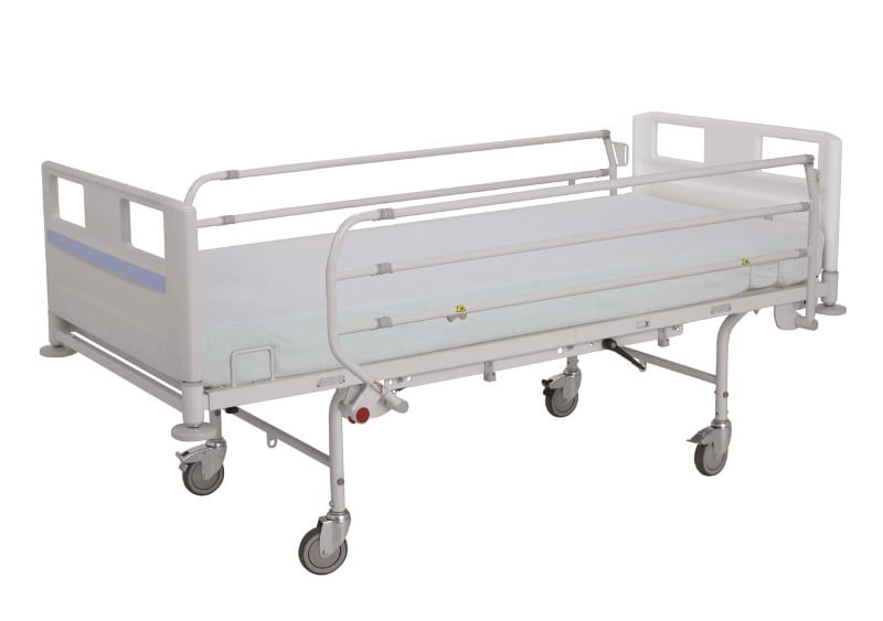 A hospital bed with height adjustment and mattress platform positioning by means of electric motors. The patient surface consists of 4 sections, and is made of welded meshing. The bed offers many degrees of vertical adjustment, and adjustment of patient surface area settings. A model with single collapsible side rails welded to the bed frame is also available.