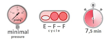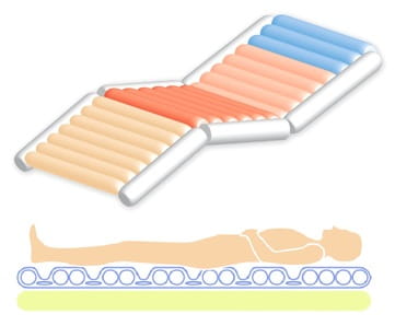 La terapia de presión alternante (tecnología de 3 celdas, presión cero, ciclos de 7,5 minutos) es el modo terapéutico fundamental que simula el movimiento natural del cuerpo y de esta manera previene y trata las úlceras de decúbito.