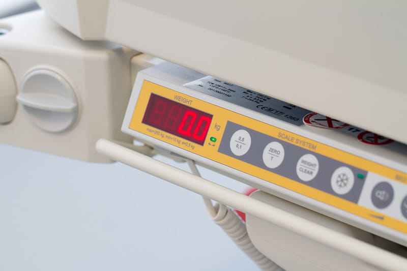 Eleganza 3XC est équipé d’un système de pesée intégré avec double écran permettant de peser le patient directement sur le lit, dans toutes les positions, sans le déplacer ou le transférer. Eleganza 3XC mesure la valeur de poids absloue (1er écran) et détecte toutes variations (2ème écran) indépendamment de la position du lit (ajout d'accessoires, de couverture...).