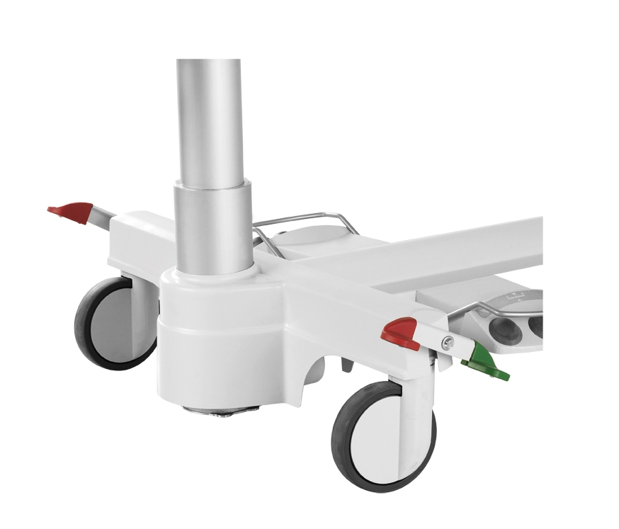 Lorsque la 5ème roue directionnelle n’est pas utilisée, elle peut être rétractée dans le châssis du lit. Ainsi le châssis bas est dégagé pour le passage d’une table à manger au lit ou pour le nettoyage des sols. La 5ème roue est positionnée au centre du chassis bas et permet au soignant de manipuler sans effort : le lit suit la direction voulue même dans les couloirs les plus exigus. Le soignant ne peine plus à diriger le lit, il ne le pousse pas et donc ne fait pas d’efforts supplémentaires. Les bras et le dos sont soulagés.