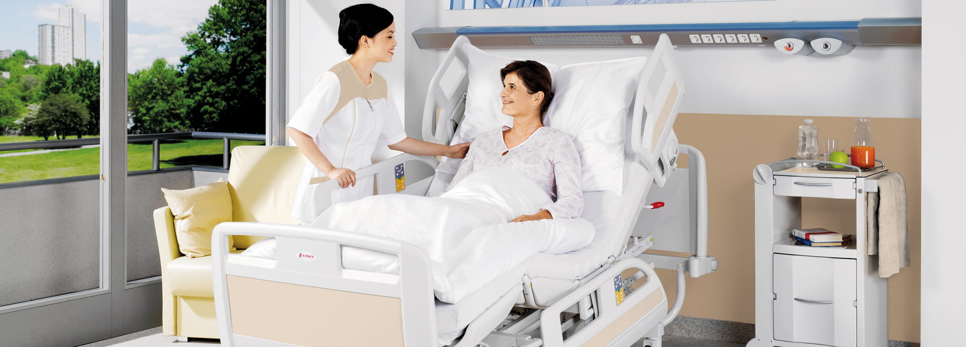 Eleganza 3 influence positivement le traitement des patients en rendant plus simple le travail du personnel soignant à l‘aide de propriétés uniques. Le lit hospitalier moderne n‘est plus qu‘une simple surface de couchage: Eleganza 3 contribue activement aux thérapies et aux traitements grâce à des fonctionnalités innovantes et autres supports de mobilisation intégrés.
