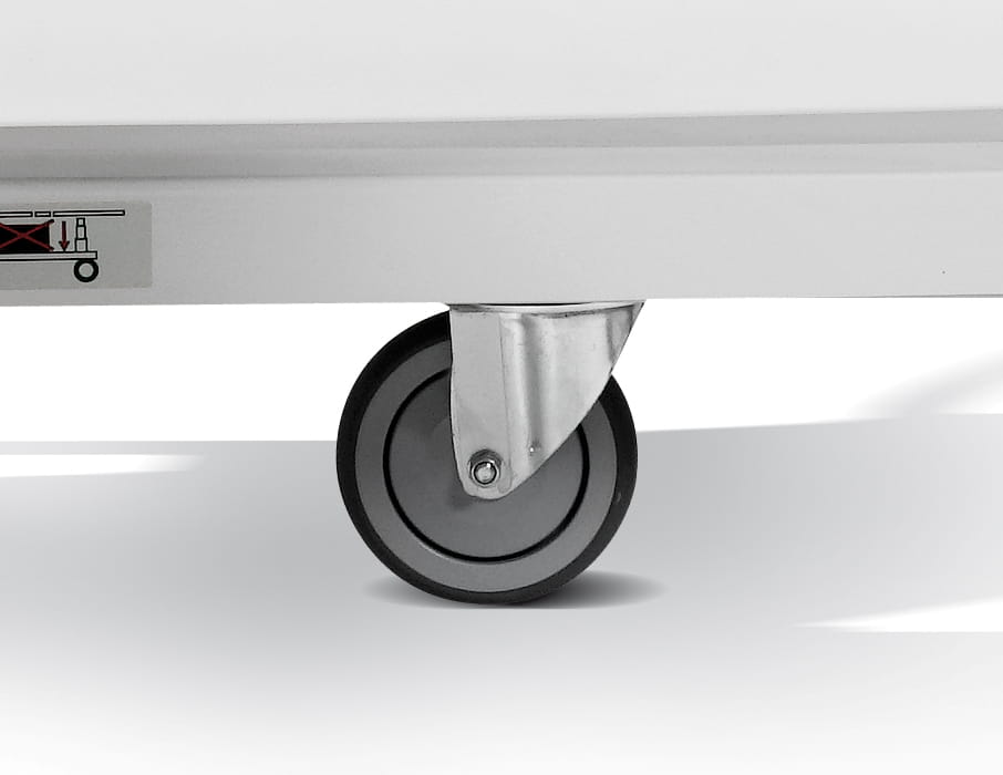 La 5ème roue directionnelle simplifie considérablement la manipulation du lit lors des brancardages, notamment dans des espaces restreints, tels que les couloirs ou la chambre. Grâce à la 5ème roue, il est possible de manoeuvrer le lit sur place. Dans de longs couloirs, elle permet de maintenir une direction droite et par conséquent de diriger le lit sans écart. Une manipulation simple dès le transport contribue à la diminution des efforts physiques pour le soignant et à plus de confort pour le patient.