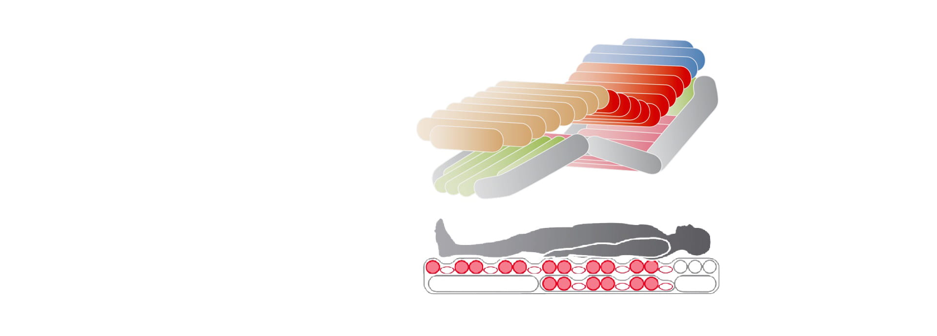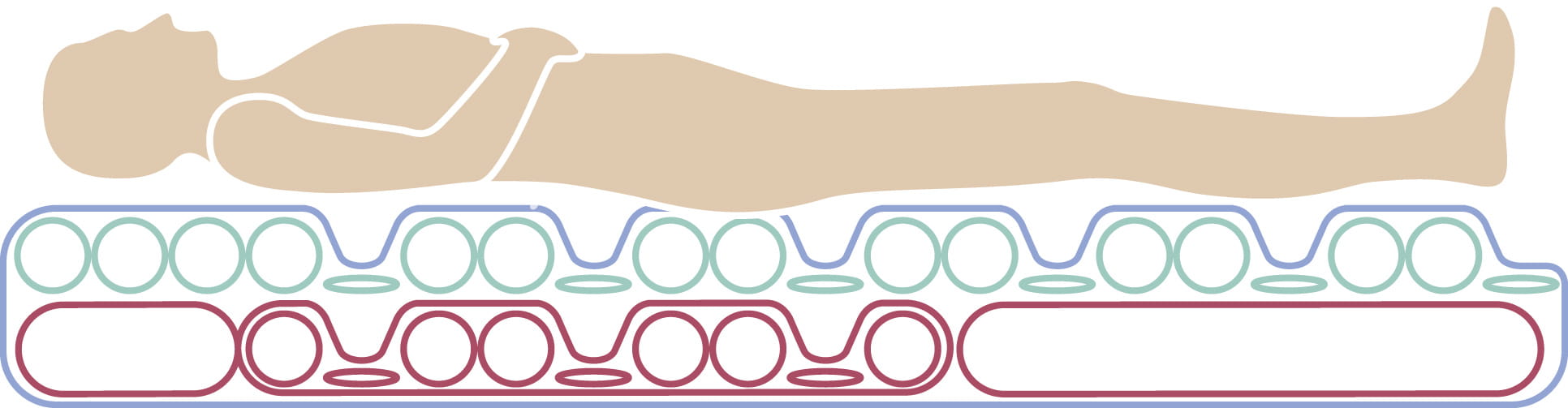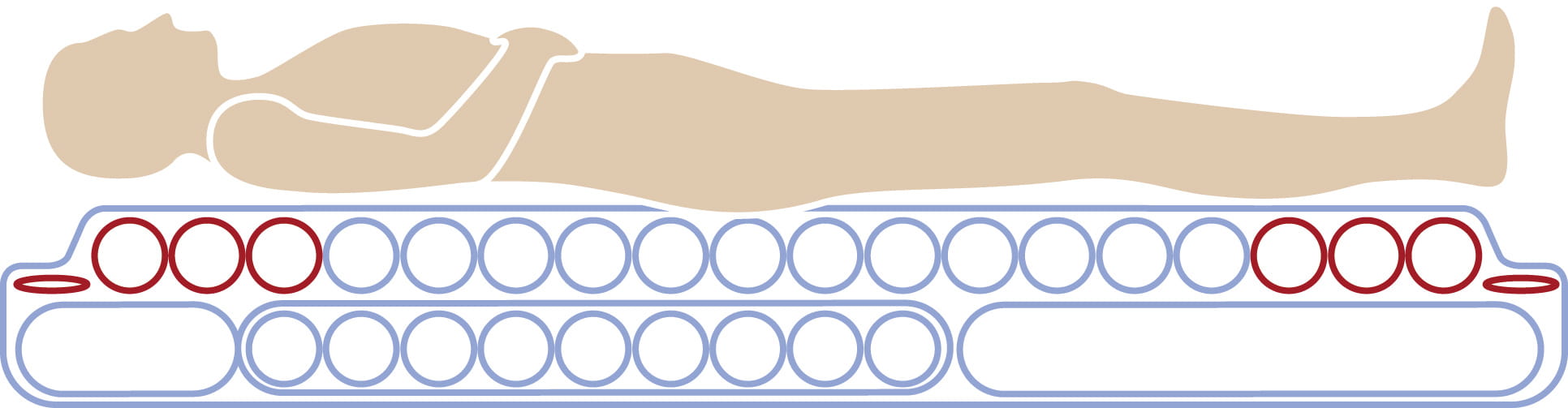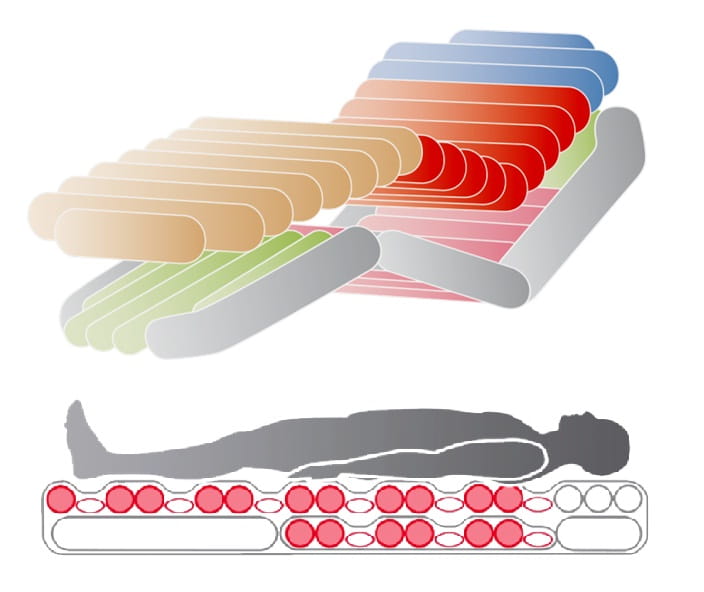 Suppression totale de la pression : la conception des cellules d’air connectées entre elles et complètement vidées 1 fois sur 3, permet une suppression efficace de la pression. Il a été prouvé que cela augmente le débit moyen du sang dans les tissus et accélère la cicatrisation.