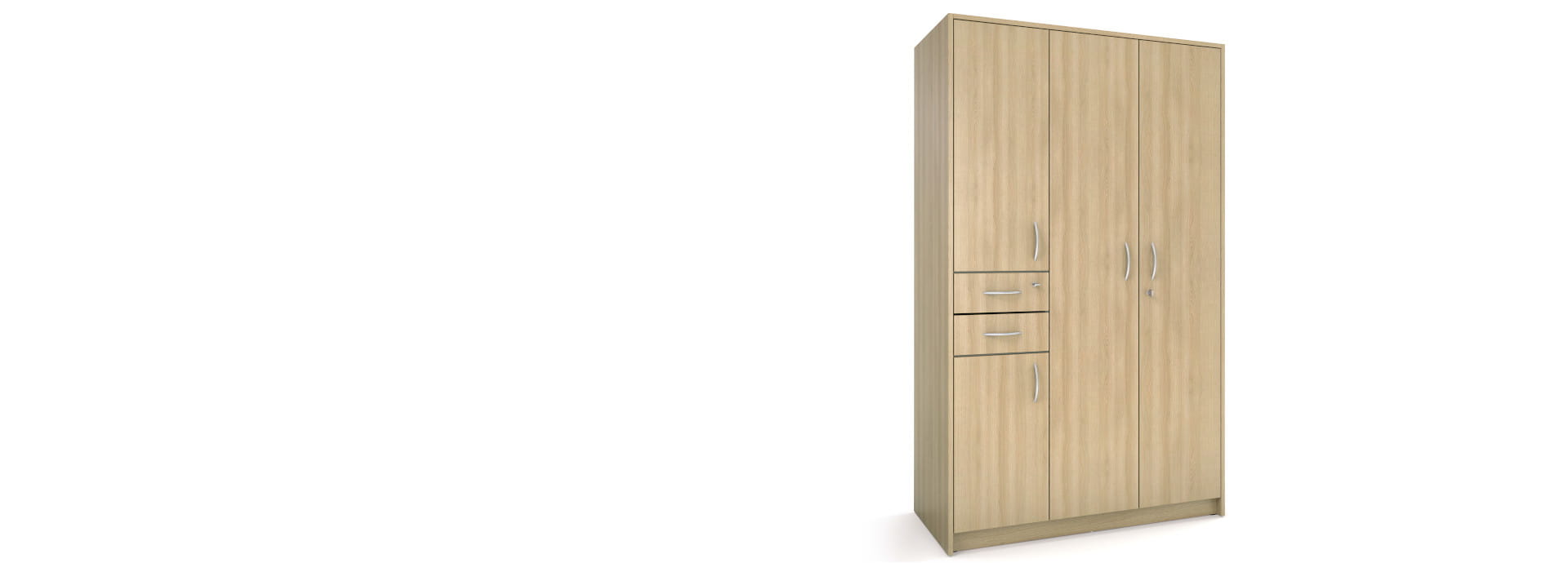 Armoire une personne à 3 portes, avec tringle à vêtements et étagères L'armoire offre un espace de rangement spacieux. Avec ses poignées incurvées de 128 mm, elle est également très facile à utiliser par le résident. Les amortisseurs intégrés minimisent le niveau de bruit lors de la fermeture des portes.