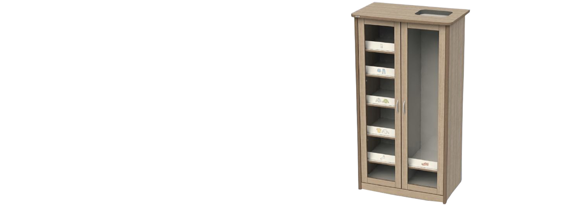 Une armoire spécialement conçue pour les résidents atteints de démence. Les deux couleurs favorisent la reconnaissance des contours et minimisent le risque de blessures. Les bords au profil arrondi contribuent également à la sécurité. La porte transparente permet d'identifier le contenu de l'armoire en un instant. L'espace de rangement est amplement suffisant pour les vêtements et les effets personnels.