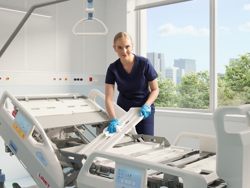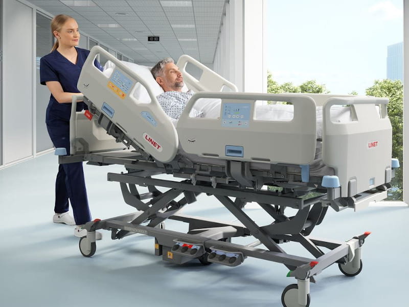 Universeel ziekenhuisbed met een uitzonderlijk hoge toelaatbare belasting van 300 kg verbetert de veiligheid voor alle patiënten. Laterale kanteling wordt de nieuwe gouden standaard in de acute zorg