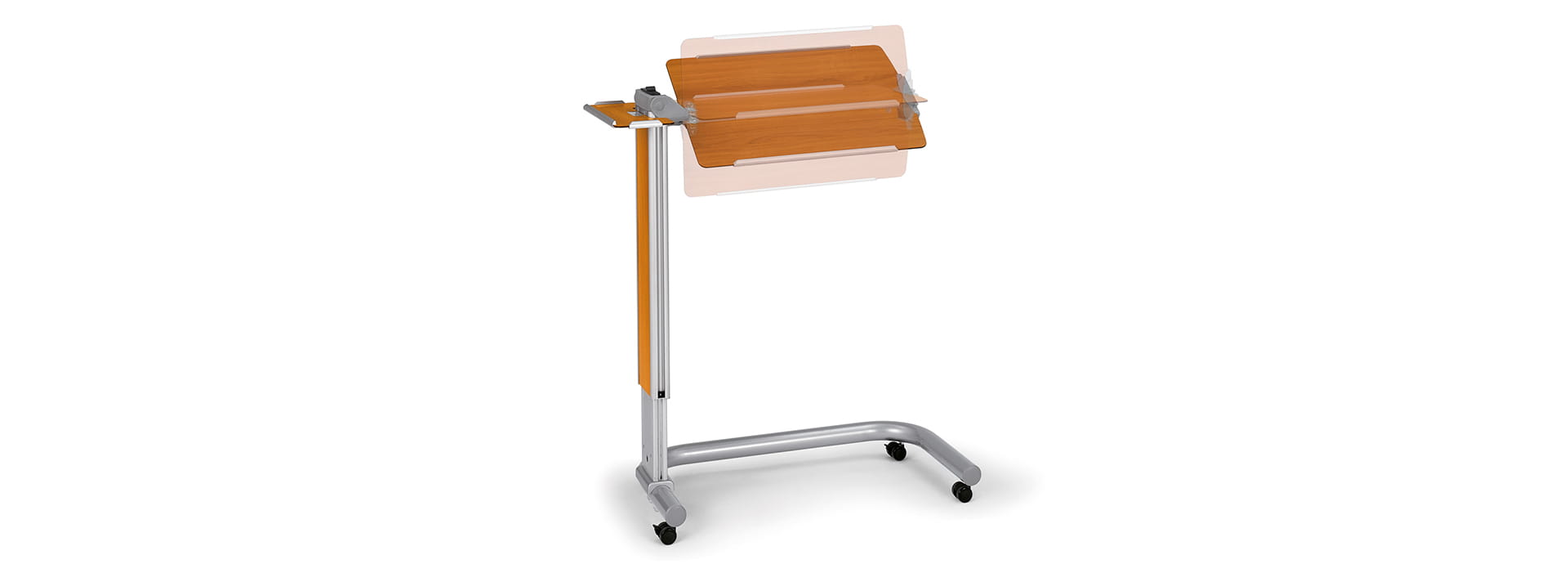 De serveertafel s3t biedt een hoge gebruikswaarde door een extra aflegruimte, die vastgezet is en niet apart kan worden versteld. Voorbeeld: De patiënt kan tegelijkertijd lezen en koffie drinken.