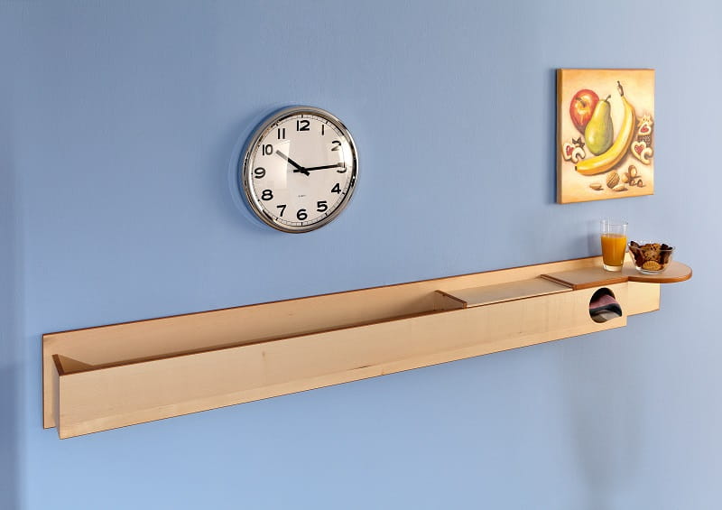 Stimulatie- en snackbar die de bewoners de mogelijkheid biedt om snacks te pakken en een positieve ervaring creëert. De twee kleuren zorgen ervoor dat de contouren beter worden herkend door de bewoner en zodoende het verwondingsgevaar wordt verminderd.